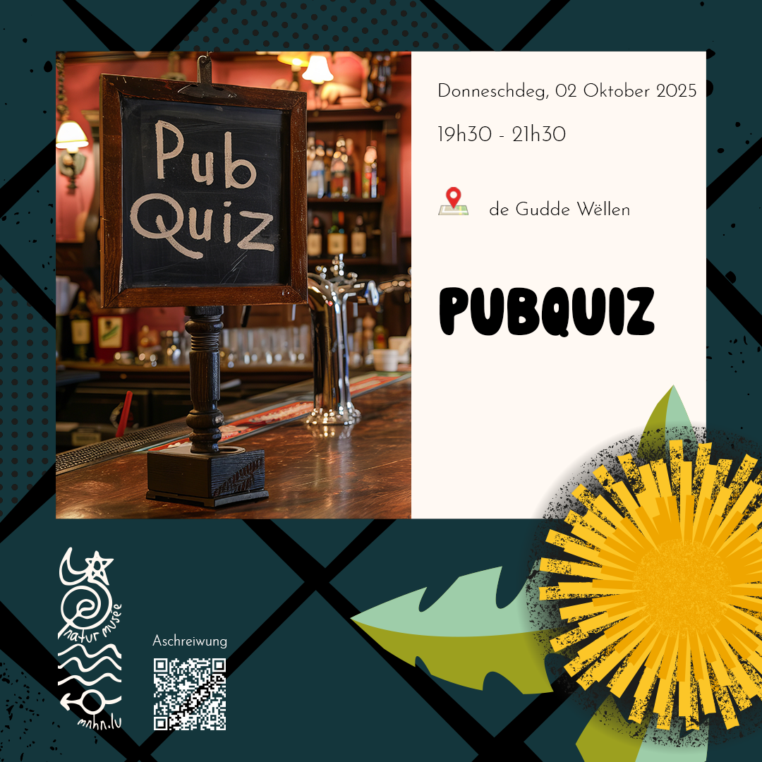 Prett är gro Zellen e bëssen ze challengen? Dann zeckt net an zockt mat eis! An engem spannende Pubquiz zum Thema Biodiversitéit fuerdere mir iech eraus! Wat hunn den Testosteron vun der Märel an de Blosaiergehalt vum wäisse Kléi mam urbane Liewen ze dinn? Erkenn dir d'Biodiversitéitshotspots zu Lëtzebuerg?
